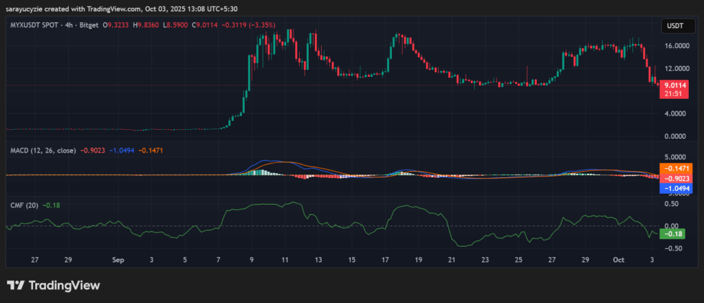 ومن الجدير بالذكر أن أصولًا مثل BNB وCAKE احتلت مكانة بين العملات الرائجة، حيث تم تداولها على ارتفاع. وعلى وجه الخصوص، خسرت MYX Finance (MYX) 42.4% من قيمتها خلال الـ 24 ساعة الماضية. في الساعات الأولى من التداول، تم تداول الأصل عند أعلى مستوى له عند 15.66 دولارًا. ومع هذا التراجع، ارتد السعر نحو أدنى مستوى له عند 8.65 دولارًا.