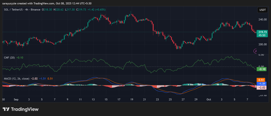 يقع خط تقارب وتباعد المتوسط ​​المتحرك (MACD) لسولانا تحت خط الصفر، لكن خط الإشارة أعلى من الصفر. يشير هذا التقاطع إلى زخم متباين. الاتجاه العام هبوطي، ولا يزال الزخم قصير الأجل مستقرًا. علاوة على ذلك، يشير مؤشر تشايكين للتدفق النقدي (CMF) عند -0.10 إلى ضغط بيع معتدل في السوق. يتدفق النقد للخارج، وقد يواجه سهم سولانا ضغطًا هبوطيًا ما لم يزداد زخم الشراء.