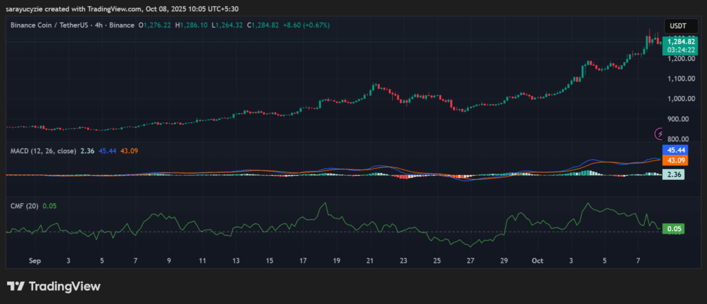 مع التركيز على التحليل الفني لـ BNB، تجاوز خط تقارب وتباعد المتوسط ​​المتحرك (MACD) خط الإشارة، مما يشير إلى زخم صعودي. قد تكتسب حركة السعر مزيدًا من القوة وتستمر في الارتفاع. علاوة على ذلك، تشير قيمة مؤشر Chaikin Money Flow (CMF) البالغة 0.05 إلى ضغط شراء طفيف في سوق الأصل، ولكنه ضعيف. كما يحدث تراكم معتدل، ولكنه ليس قويًا بما يكفي لتأكيد اتجاه قوي.