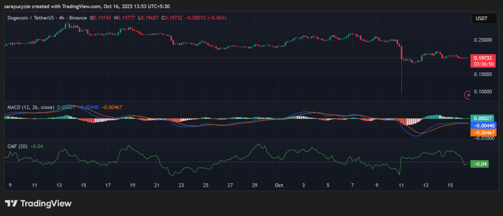 يشير خط تقارب وتباعد المتوسط المتحرك (MACD) وخط إشارة DOGE، الذي يستقر أسفل خط الصفر، إلى زخم هبوطي قوي. يتحرك السعر هبوطًا ويتوخى الحذر. علاوة على ذلك، يشير مؤشر Chaikin Money Flow (CMF) عند -0.04 إلى ضغط بيع في سوق DOGE، ولكنه ليس قويًا جدًا. والجدير بالذكر أن الأموال تتدفق خارج الأصل.