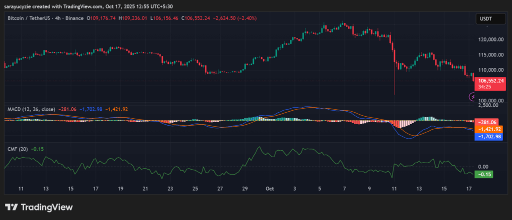 يقع خط MACD للبيتكوين أسفل خط الإشارة، وقد اخترق كلاهما خط الصفر. يشير هذا إلى اتجاه هبوطي قوي، مع احتمال استمرار الزخم الهبوطي، واحتمالية انخفاض السعر. علاوة على ذلك، يشير مؤشر CMF عند -0.15 إلى ضغوط بيع في سوق البيتكوين، مع توجه هبوطي معتدل. تشير القيمة السلبية إلى تدفق المزيد من الأموال إلى الخارج بدلاً من الداخل.