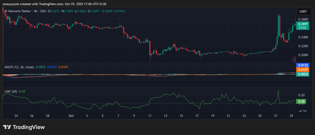 ووفقًا لبيانات CoinMarketCap، يتم تداول PI حاليًا ضمن نطاق 0.2691 دولار. علاوة على ذلك، وصلت القيمة السوقية للأصل إلى 2.23 مليار دولار، مع ارتفاع حجم التداول اليومي بأكثر من 173%، ليصل إلى علامة 121.86 مليون دولار.