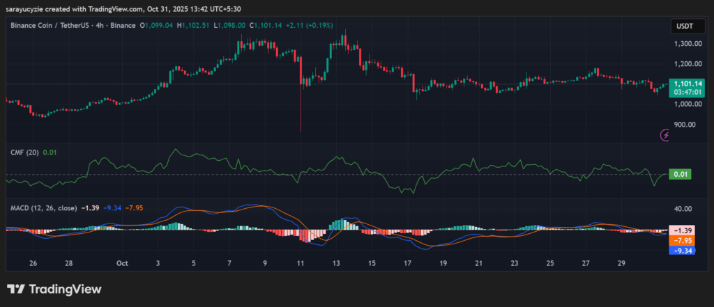 يقع خط تقارب وتباعد المتوسط المتحرك (MACD) وخط الإشارة لـ BNB تحت خط الصفر، مما يشير إلى مرحلة هبوطية. قد يستمر ضعف الأصل حتى حدوث انعكاس. إضافةً إلى ذلك، يشير مؤشر Chaikin Money Flow (CMF) عند 0.01 إلى زخم محايد إلى صعودي طفيف. ضغط الشراء والبيع متوازن تقريبًا. هناك ميل طفيف نحو التراكم.