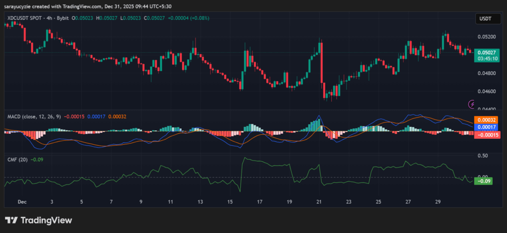 افتتحت العملة تداولاتها في آخر يوم من عام 2025، مسجلةً أعلى مستوى لها عند 0.05109 دولار. ومع سيطرة البائعين على سوق XDC، انخفض السعر إلى أدنى مستوى له عند 0.04983 دولار. وفي وقت كتابة هذا التقرير، يتم تداول شبكة XDC عند 0.05016 دولار، مع وصول حجم تداولها اليومي إلى 32.86 مليون دولار بعد انخفاض طفيف.