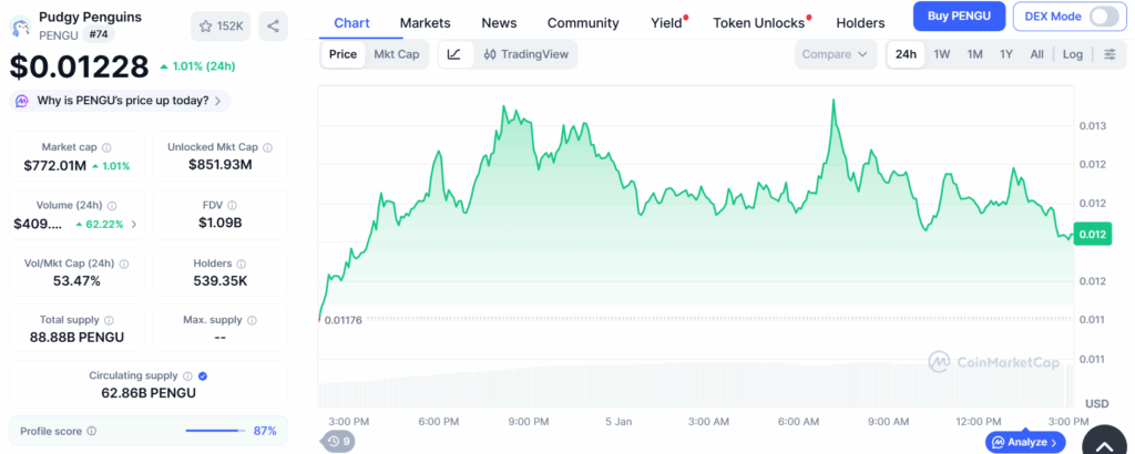 - كان آخر سعر تداول لسهم PENGU هو 0.0128 دولار، مرتفعًا بنسبة 1.01% خلال الـ 24 ساعة الماضية.