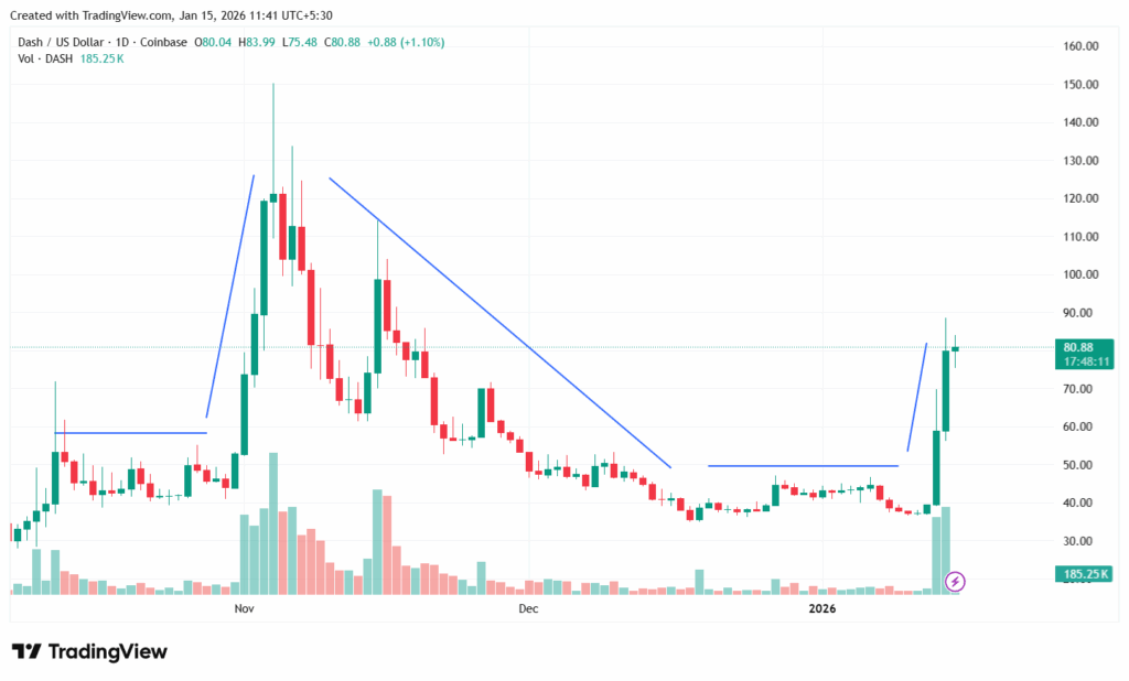 تستند إمكانية التداول عند حوالي 88 دولارًا إلى النمط السابق. استقر سعر عملة داش في أواخر نوفمبر 2025، ثم ارتفع إلى 120 دولارًا قبل أن يتراجع إلى أدنى مستوى له عند حوالي 40 دولارًا. ثم استقر مرة أخرى من أواخر ديسمبر 2025 إلى أوائل يناير 2026 قبل أن يرتفع إلى قيمته الحالية.