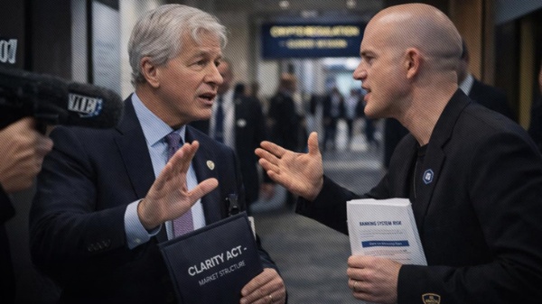 أعاد الخلاف الحاد بين منصة Coinbase وبنوك أمريكية كبرى تسليط الضوء على قانون CLARITY. ويُناقش مجلس الشيوخ حاليًا مشروع قانون هيكلة سوق العملات الرقمية. وخلال المنتدى الاقتصادي العالمي في دافوس، دار نقاش حاد بين برايان أرمسترونغ، الرئيس التنفيذي لشركة Coinbase، وجيمي ديمون، الرئيس التنفيذي لشركة JPMorgan، حول بنود مشروع القانون الحالية. وقد أبرز هذا التوتر القائم بين القطاع المالي التقليدي وقطاع الأصول الرقمية سريع النمو.
