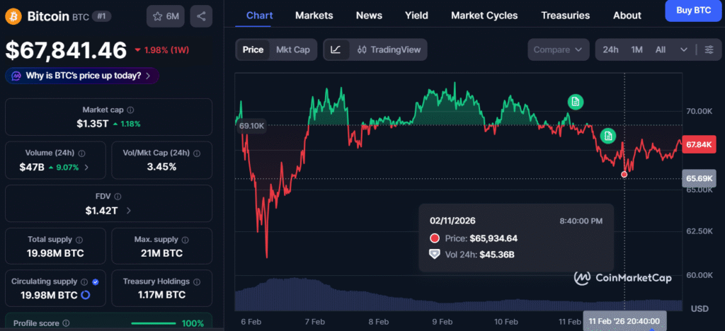 أيضًا، في اليوم نفسه، تم تداول البيتكوين بسعر منخفض يقل عن 66,000 دولار. حاليًا، أثناء كتابة هذا المقال، ارتفع سعر البيتكوين بنحو 1.23% ويتداول عند 67,841 دولارًا؛ ولكنه لا يزال منخفضًا بنحو 1.98% خلال الأسبوع الماضي، وبأكثر من 26% خلال شهر.