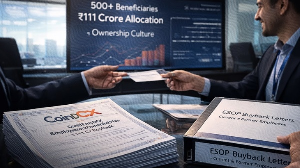 أعلنت منصة CoinDCX، وهي بورصة هندية مقرها مومباي، عن برنامج إعادة شراء أسهم بقيمة 111 كرور روبية (12.24 مليون دولار أمريكي) ضمن خطة ملكية أسهم الموظفين، ما يتيح لأكثر من 500 موظف حالي وسابق تحويل جزء من أسهمهم في الشركة إلى نقد. وقد أعلن سوميت غوبتا، المؤسس المشارك لـ CoinDCX، عن برنامج إعادة الشراء عبر منصة لينكدإن، والذي يُعد مكافأة للموظفين الذين ساهموا في بناء الشركة على مدار السنوات الثماني الماضية.